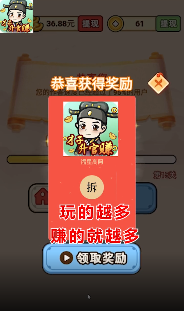 《才子升官赚》是一款集趣味性与福利于一体的红包游戏,融合了猜成语、歇后语等热门玩法,让玩家在轻松娱乐的同时还能赢取现金红包。游戏操作简单,奖励丰厚,提现秒到账,无需繁琐流程,真正做到边玩边赚。无论是成语达人还是休闲玩家,都能在这里找到乐趣,每天参与答题即可累积红包,随时提现,快来加入这场知识与财富的双重盛宴吧!