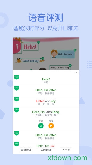 口语训练:课文同步对话,角色扮演、智能评分、矫正发音,让你忍不住开口说英语。支持多人对话模式,孩子可以和虚拟角色互动,在真实语境中练习日常英语表达。
