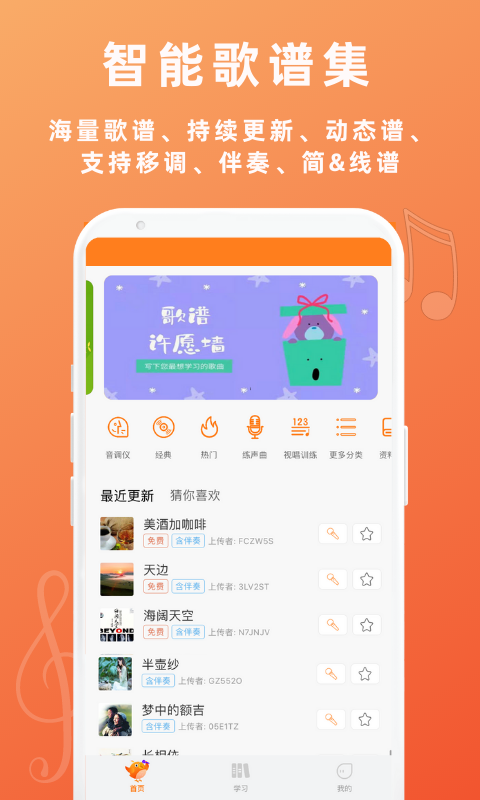 音壳教唱歌拥有庞大的智能歌谱库,涵盖各种风格的流行歌曲和经典曲目,并保持持续更新。用户不仅可以收藏喜爱的歌谱,还能上传个人创作的曲谱与社区分享。动态谱功能让学习更加直观,移调、伴奏等实用工具则能满足不同演唱需求。无论是简谱还是五线谱,都能在这里找到最适合的版本,让音乐学习变得更加便捷高效。