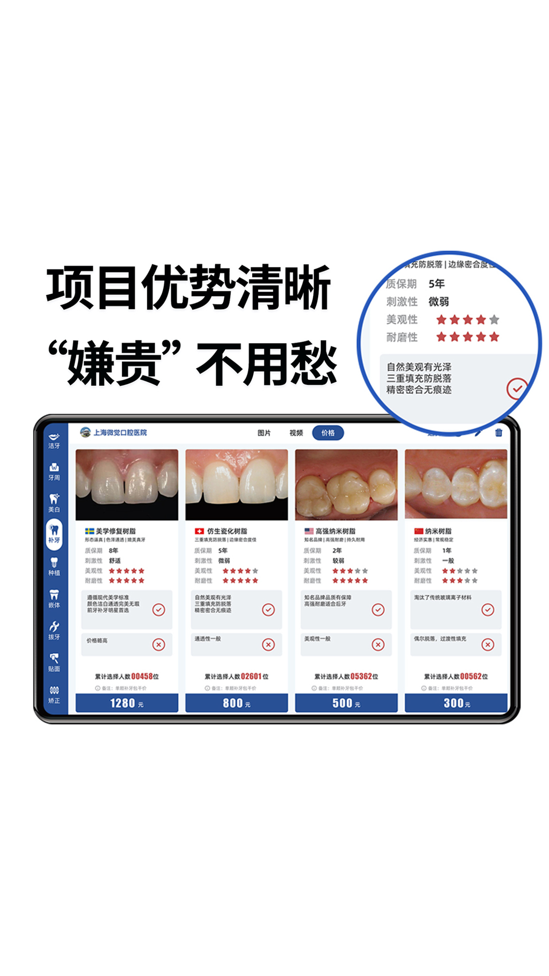 软件内置海量专业病种沟通素材,包含图文解析和高清视频科普内容,涵盖种植牙、正畸、美学修复等常见口腔治疗项目。这些经过权威认证的素材不仅能辅助医生快速完成专业讲解,还能帮助患者更直观地理解治疗方案。每个治疗项目都配有清晰的价格明细和分级报价体系,支持自定义价格设置,让报价过程透明化、规范化。