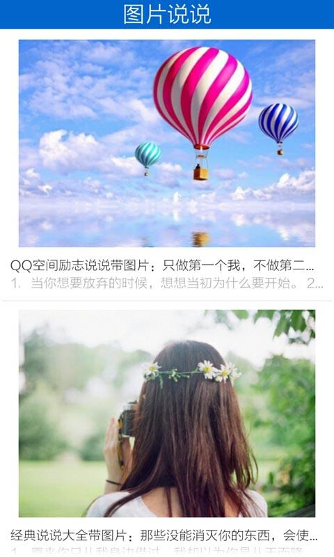 这里有看了想哭的说说,有单身伤感的说说,有忧伤的心情短语,也有搞笑的图片。关于友情,关于爱情,伤感的时候想说点什么呢,不用烦恼,本应用提供最新最全的个性说说,一键分享即可,方便快捷。我们还特别设置了心情日历功能,可以记录你每天的心情变化,形成专属的心情轨迹。同时支持离线阅读,在没有网络的情况下也能随时查看收藏的说说。