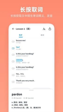支持课文长按查词:在阅读课文时,长按单词即可快速查询释义,提升学习效率。