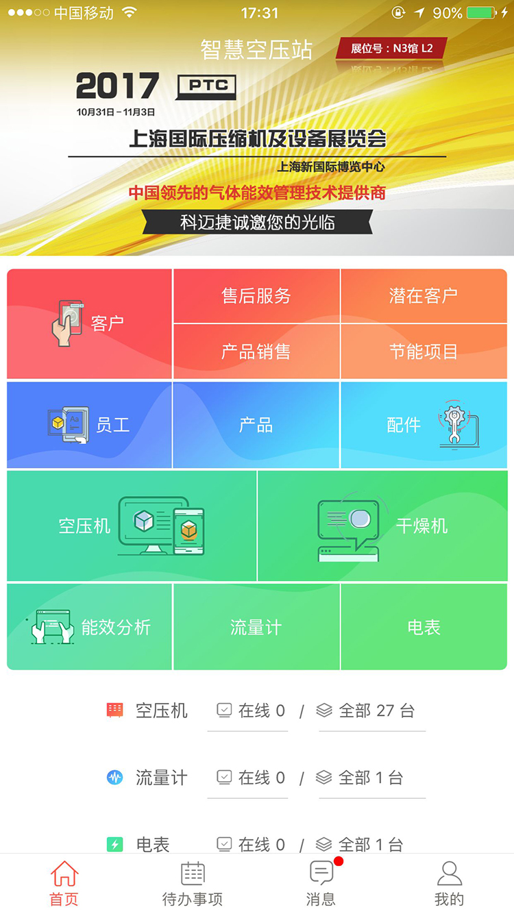 智慧空压站App的首页设计简洁明了,功能模块划分清晰,让用户能够快速找到所需功能。主要功能模块包括客户管理、售后服务跟踪、潜在客户开发等客户关系管理功能;产品销售管理、节能项目推进等业务管理功能;员工管理、产品信息维护、配件库存管理等基础管理功能;空压机运行监控、干燥机状态监测等设备管理功能;以及能效分析、流量计数据采集、电表监控等能耗管理功能。这些功能模块相互配合,为用户提供全方位的空压站管理支持。