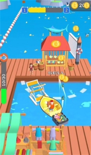 操作方式简单直观,只需滑动屏幕就能控制帆船移动。随着游戏进程,玩家可以在浮动渡轮商店升级船只性能,包括动力、速度和载货量。这些升级将帮助你捕捉更稀有的大型鱼类,同时还能在服装商店为角色添置新装。