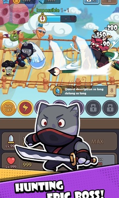 点击后进入游戏,游戏中的小猫咪会自动前进并战斗,将前方的敌人全部击败,点击下面的升级按钮可以提升猫咪的攻击力;