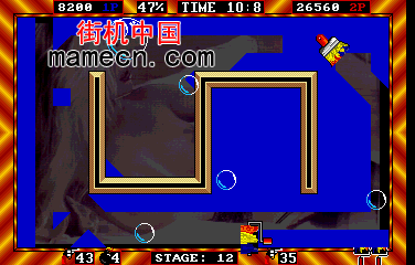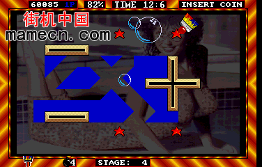 2.游戏开始后,会出现一随意变化的白色框,玩家可按画线准备键决定其大小。在决定之后,若范围框大于 5%,则会增加一颗炸弹数。而画面中的蓝色部份,就是玩家要框取的范围,框取蓝色部份若达 80% 以上,即可到达下一个关卡进行挑战。倘若框取蓝色部份达 90% 以上,增加生命数一只。要是玩家完成度达 100% 的话,则除了可以增加生命数二只,还可以得到此张美眉的图片呦~~