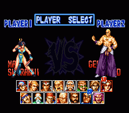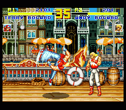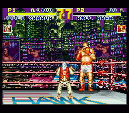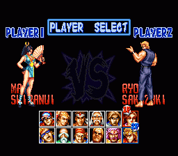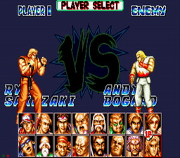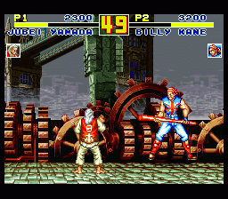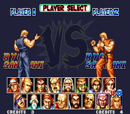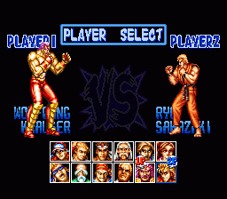 SFC的欧版《饿狼传说特别版》,容量只有24M,比日版和美版整整少了8M,可供选择的人物由原来的16人削减为12人,不过隐藏角色“坂崎亮”却可直接选用。 |