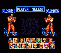 SFC版(日版 / 美版 / 欧版) 专用秘技 选择角色时,只需按下L键或R键来决定人物,便可选到人物的另外一种颜色(其实也就是人物的2P颜色)。 |