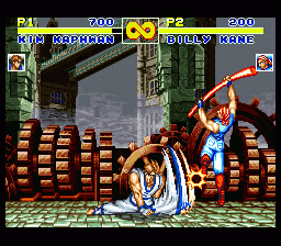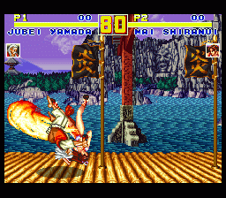SFC版(日版) 专用秘技 当“不知火舞”使出“龙炎舞”时,在火炎出现的瞬间,“山田十平卫”马上发出重踢键蓄力的“大炸弹落”(按住重踢键5~19秒),便会看到“不知火舞”中招时身上的火炎却没有消失。 当“比利”使出“三节棍中段打”时,在三节棍伸长的瞬间,“山田十平卫”马上发出重踢键蓄力的“大炸弹落”(按住重踢键5~19秒),便会看到“比利”中招时三节棍伸长的部分却残留在画面上。 |