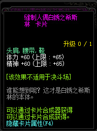 附魔部位:头肩、腰带、鞋。附魔效果:体力、精神 +60(上限: +65)