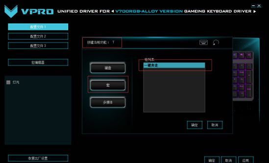 步骤三:设置好一键奔走的一系列动作之后,回到主页面,以T键为例,在设置页面,点击宏,选择刚才设置好的“一键奔走”命令,点击“确定”后,点击“应用”,即可使用。
