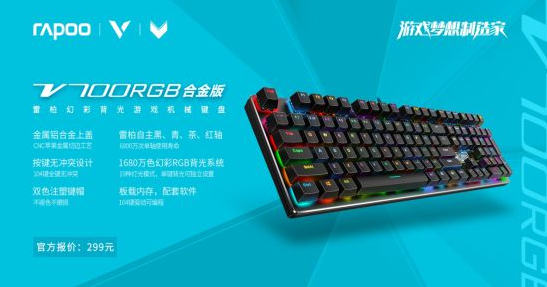 RAPOO雷柏,领军国产外设品牌,实力大厂上市企业发布的V700RGB合金版幻彩背光游戏机械键盘,1680万色的幻彩RGB背光系统,19种的灯光模式,并支持单键背光可独立设置。金属的铝合金上盖,全键无冲突,全键可编程等诸多亮点集一身的雷柏V700RGB合金版,强大的驱动软件也让键盘的可玩性获得更大的提高,售价仅为299元,相信它一定会成为你首选的游戏利器,给你畅快的游戏操作体验。