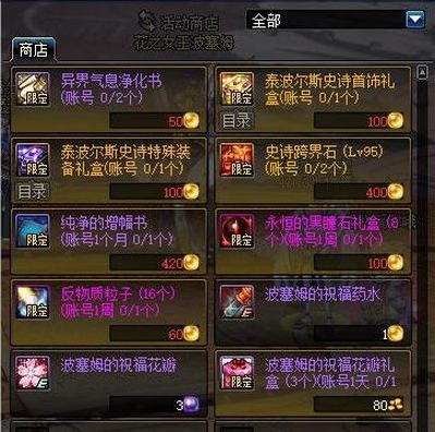 玩家获得辉煌的金色气息可以在活动商店花之女王波塞姆处兑换异界气息净化书、泰波尔斯史诗首饰礼盒、泰波尔斯史诗特殊装备礼盒、史诗跨界石、纯净的增幅书、永恒的黑瞳石礼盒、反物质粒子、波塞姆的祝福药水等道具,其中部分道具是账号限兑的。