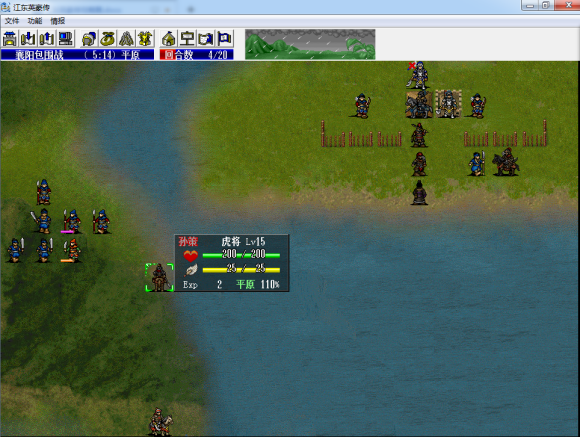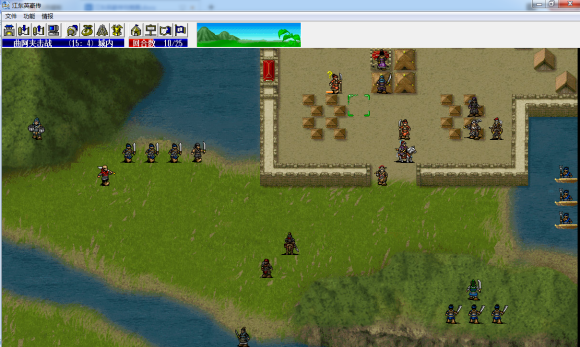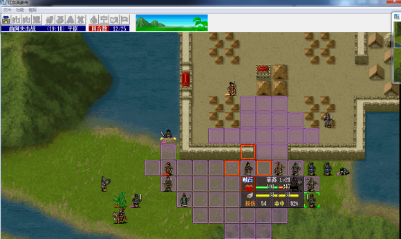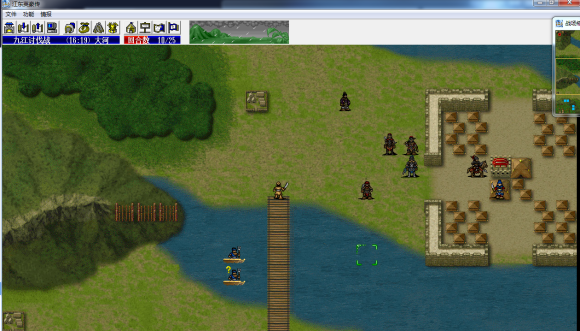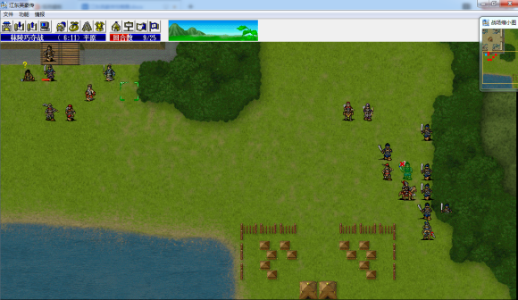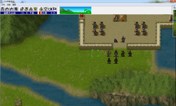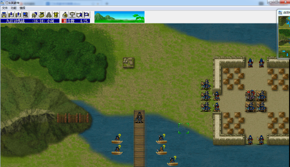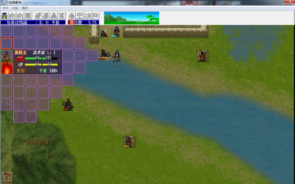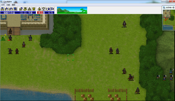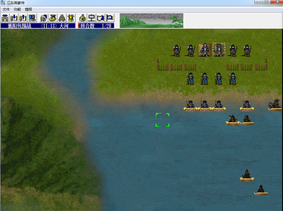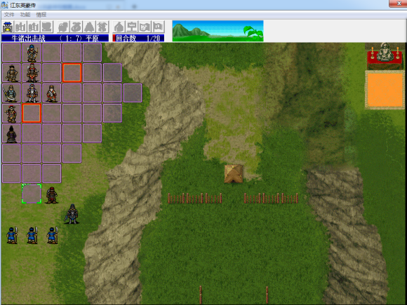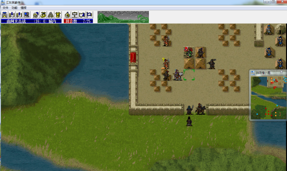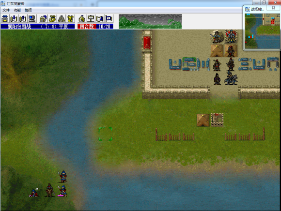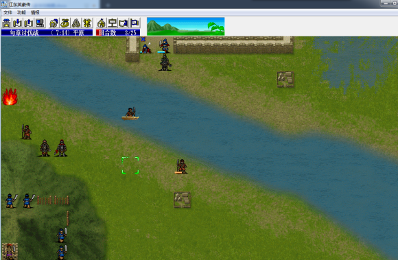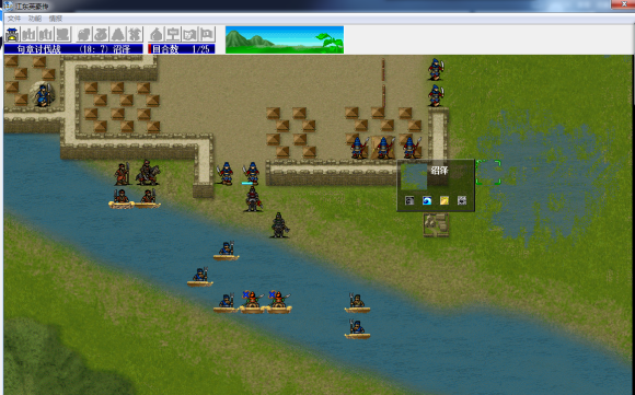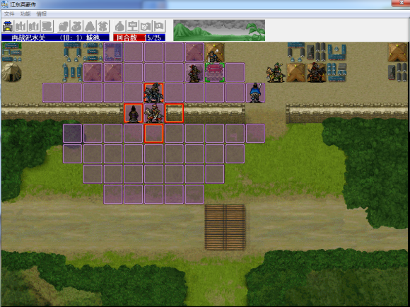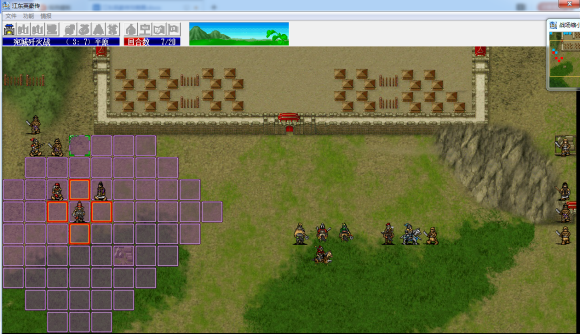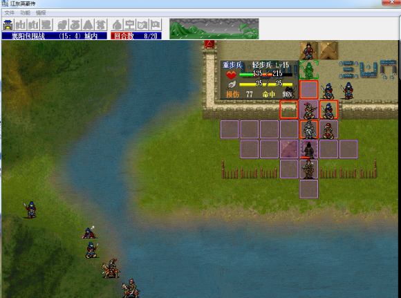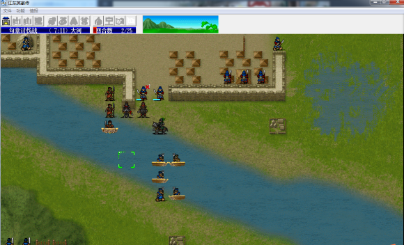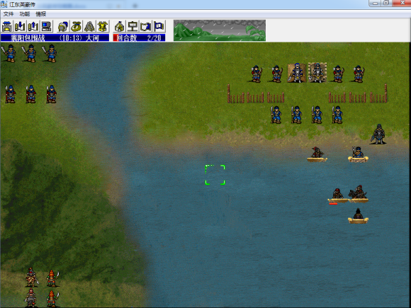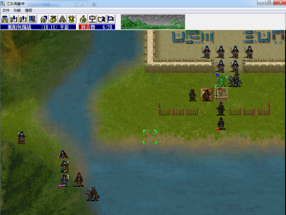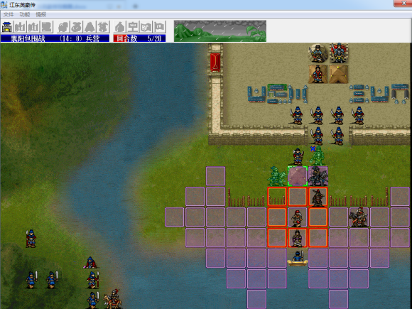 第一回合,2个友军上岸,打门口守卫的步兵,孙坚和3个壮士往右移动。敌军回合,2个水里的骑兵别管。