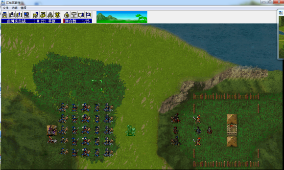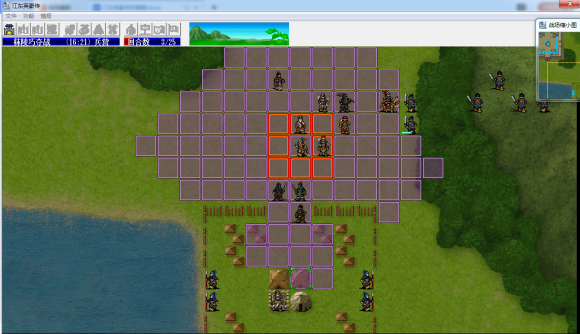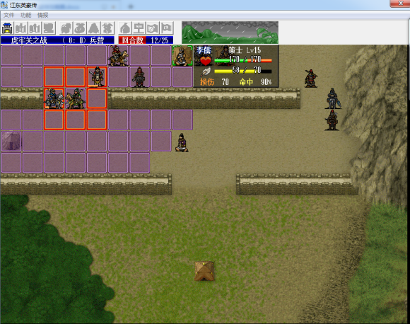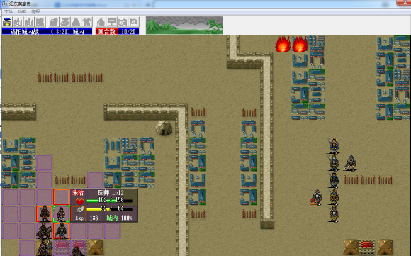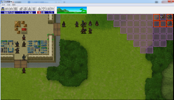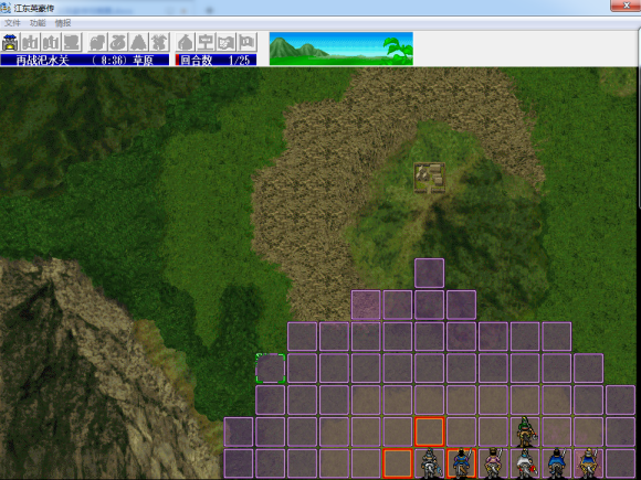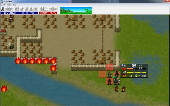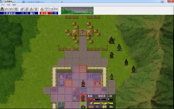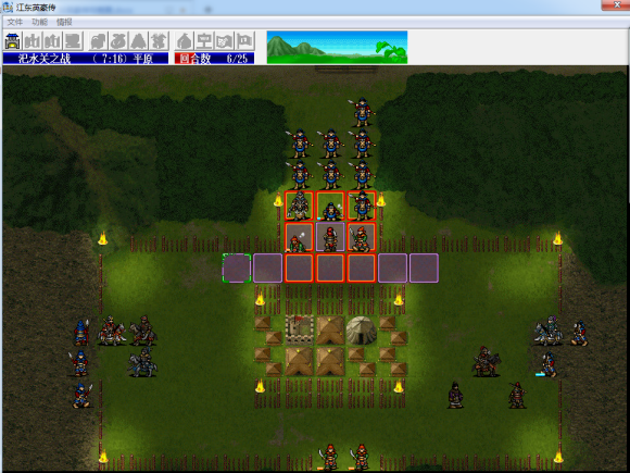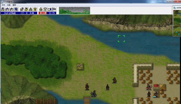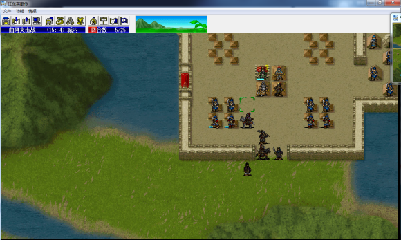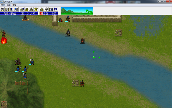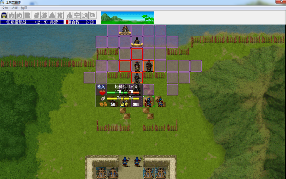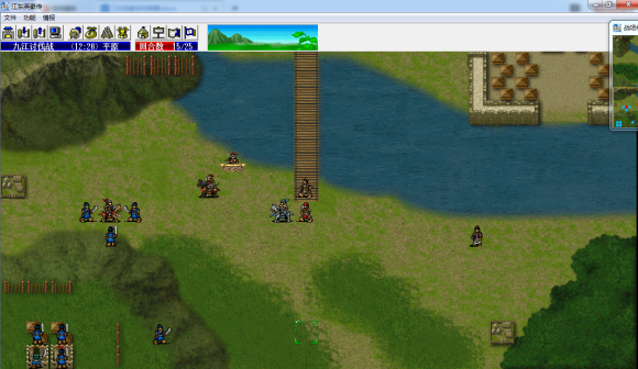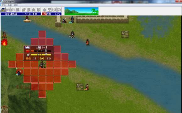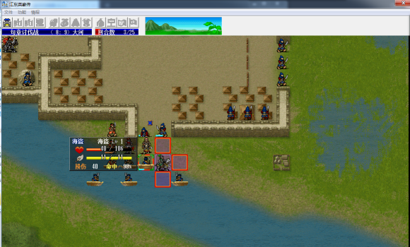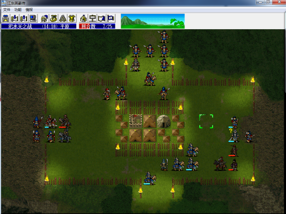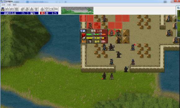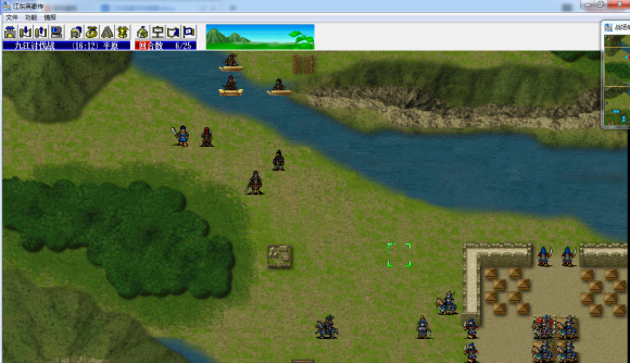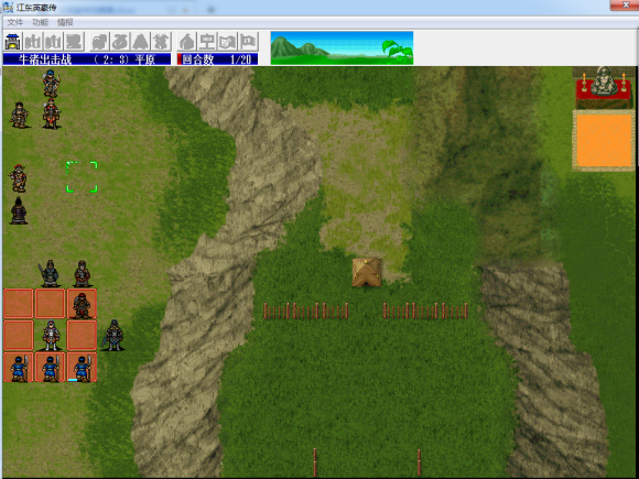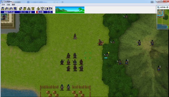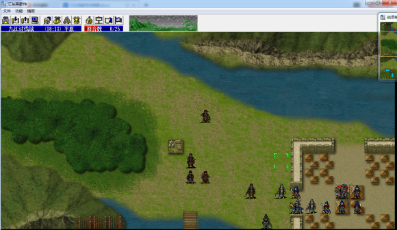 第一回合,2个友军上岸,打门口守卫的步兵,孙坚和3个壮士往右移动。敌军回合,2个水里的骑兵别管。