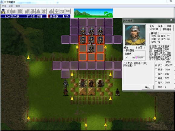第1回合,朱治移到孙坚上面2格,给3人加敏捷。程普跑到骑兵能攻击到的位置,准备反击,黄盖和韩当依次上移。