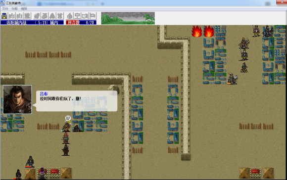 第4-5回合,右路清理完毕,大部队向左边靠拢杀敌。然而.....我黄盖却想碰一碰钉子(奉先)敌军回合,三英战吕布,吕布退回城中。我军发回大本营,我真是服了,打架就打架,关我啥事?又要重新跑那么远......