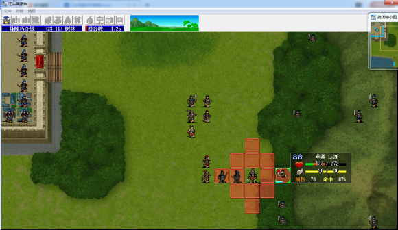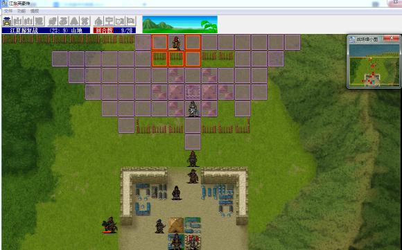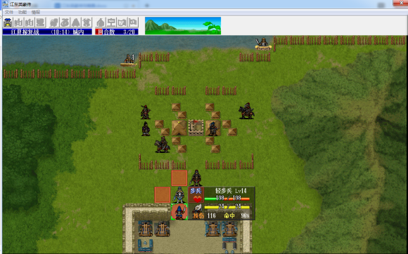 第二回合,站位如图,孙坚拉到城门口攻击步兵,藏洪拉到孙坚左侧,藏晏拉到孙坚右下卡位置,3个壮士一字排开。目的就是吸引黄龙罗,准备下回合让孙坚带走他拿经验(单挑没有经验)。