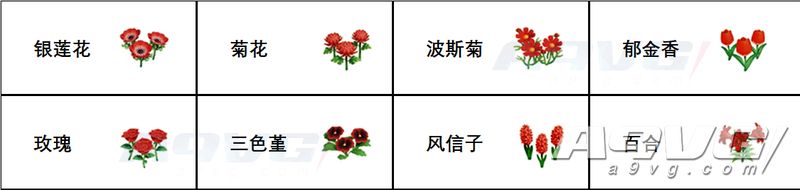 在《集合啦!动物森友会》中一共有8种花卉,它们分别是银莲花、菊花、波斯菊、郁金香、玫瑰、三色堇、风信子和百合。通过杂交可以用普