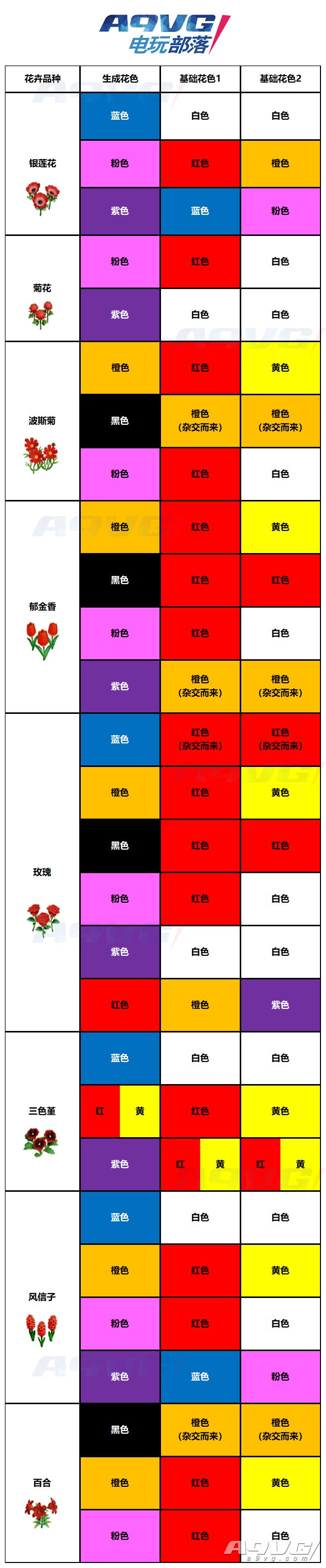 通过杂交可以诞生出更多稀有颜色的花朵,下表中备注“杂交而来”字样的花卉可以在素材岛(离岛)中挖取。