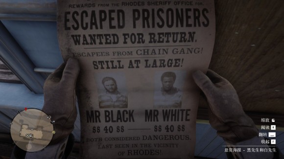 罗兹镇旁边两个从监狱里逃出来的倒霉蛋让你去收回他们的悬赏海报(共五张),收回后可以选择帮助他们烧掉海报,也可以选择把他们扭送警局。前者会丢掉这五份海报但可以触发后续几个阶段的任务,后者会保留这五份海报且获得40赏金。