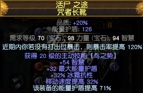 鞋子词缀选高智慧高护盾的,这个鸟之势不需要,可以找点力量属性,价格1E左右就行。