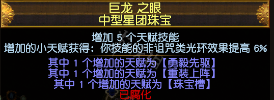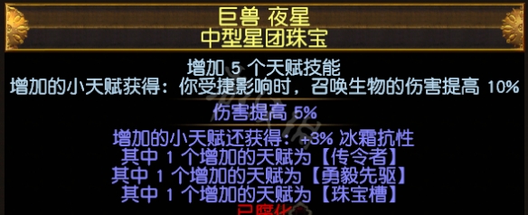 勇毅+传令+珠宝槽,需要两个,最上面增加的天赋技能4和5都行,6不行,底子选召唤生物伤害的便宜一点,2E一个,价格4E。