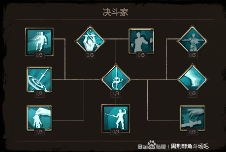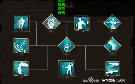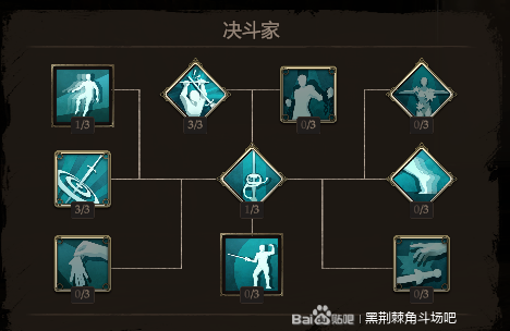 决斗家点1,基本没什么机会让你1V1,只是为了点后面技能,格挡反击必须满,长柄攻速慢,当对面A你格挡你反击,然后万一暴击了,你想想看嘿嘿。精准打击满,无视格挡闪避,必中。进阶闪避点1就行,走位用的。