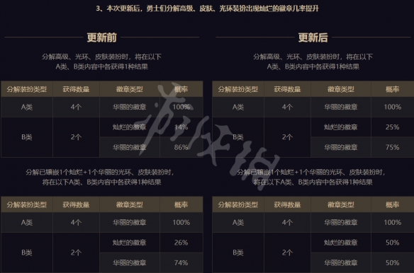 获得灿烂徽章和稀有装扮的难度降低,也意味着我们合成/分解得到白金徽章也将会越来越简单。
