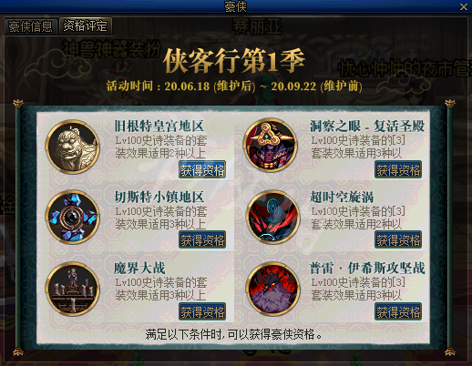 侠客行系统里面,一共有6个区域被定义为“ 可提升地下城”。每一个区域对成为豪侠都有不同的装备要求。判定以自身拥有为准,不一定要装备在角色上。