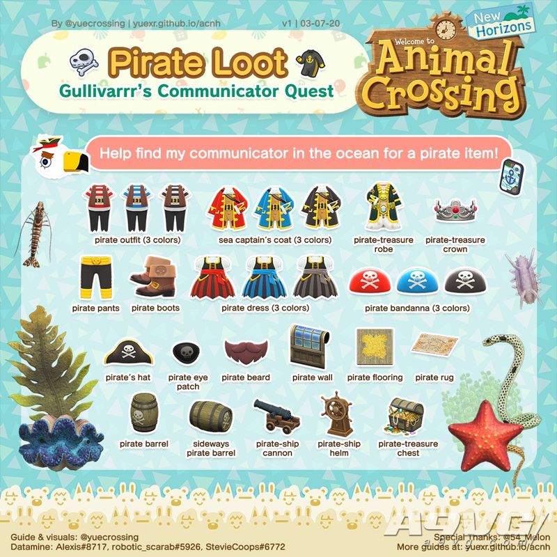此外吕游换上了海盗装,完成任务后第二天会寄给你随机的海盗系列服装和道具。这里是图鉴(图片来自推特用户yuecrossing)。