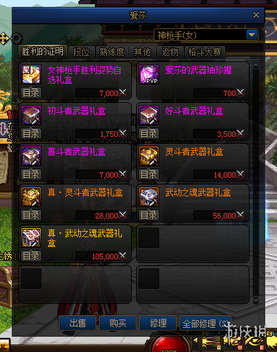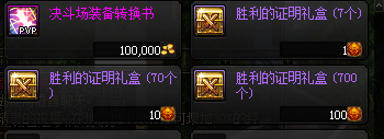 胜利的证明可以兑换决斗场的武器礼盒(真武动武器和真灵斗武器等)。所以武器并没有绝版,依旧存在。 材料的兑换都是等价的,目前国服版本兑换真武动武器需要15000斗兽场点,公平决斗场开放后,15000斗兽场点乘以7的比例刚好就是公平决斗场兑换真武动武器材料的数量。