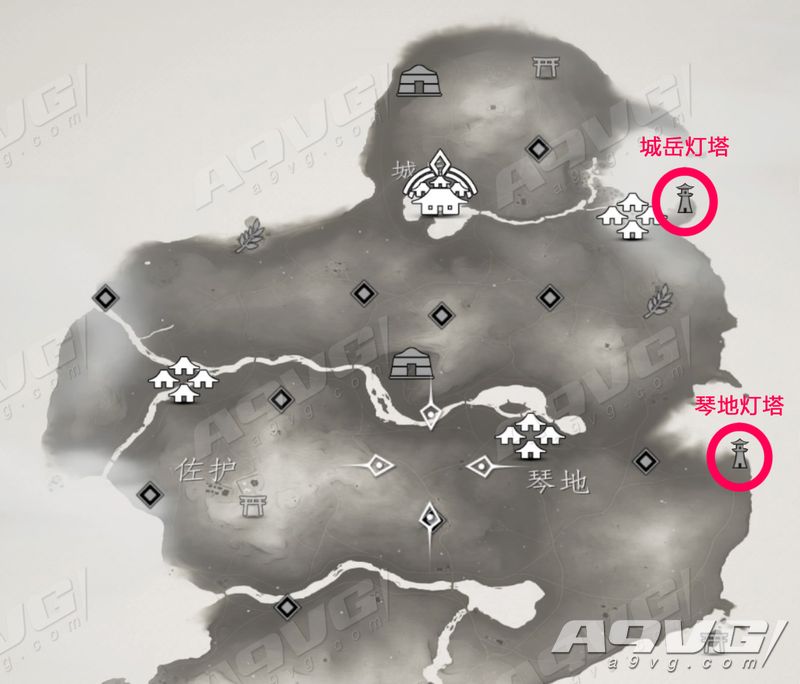 2、琴地灯塔:地图东部,岩井村东南方向。