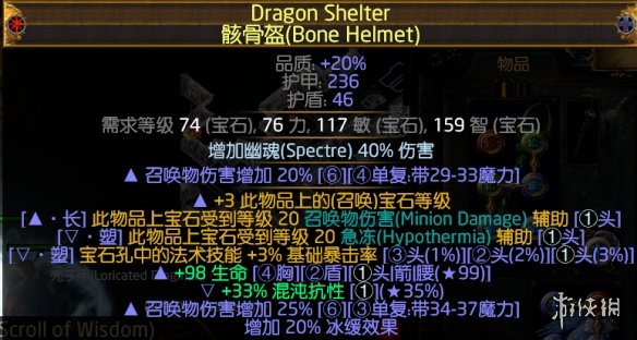 现在装备的词缀应该是+3 召唤生物伤害,防御词缀,火/电抗性急冻词缀,空一个下缀。