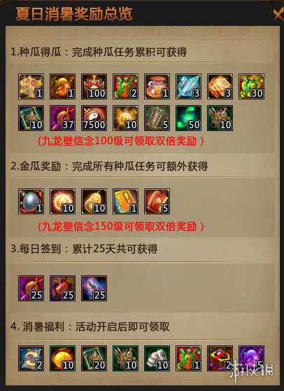 完成所有种瓜种瓜得瓜可获得以下奖励,九龙璧信念值达到150级后可获得的奖励翻倍。