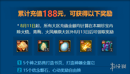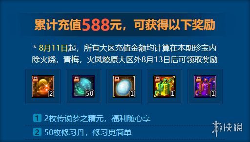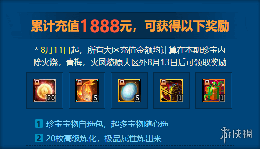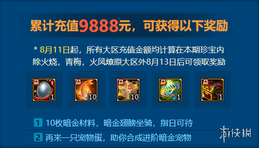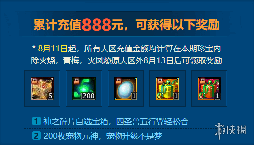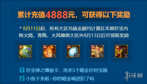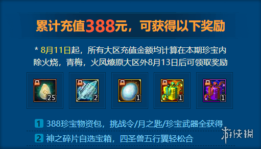 8月11日起,所有大区充值金额均计算在本期珍宝内,除火烧,青梅,火凤燎原大区外8月13日后可领取奖励。
