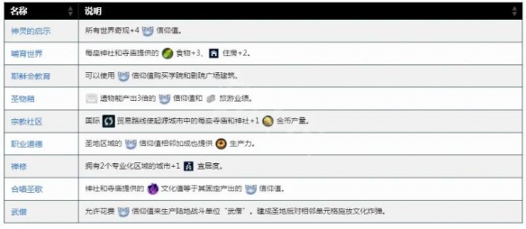 第一句话翻译一下就是城市里有什么宗教就能吃到什么宗教的其中一个buff。实战中发教收益很大程度上集中在追随者信条,毕竟这个产出非常实用且稳定。至于有哪些收益组合就直接去看下面的表格吧,不管什么教条只要能拿到三个都已经非常赚了。此外,国内大城市有3到4个宗教的信徒就可以不用建娱乐中心了,哪怕到了厌战的地步也不至于太担心叛乱。