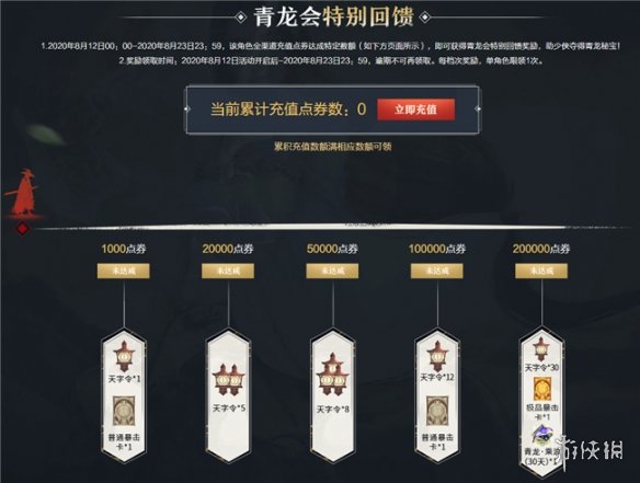 4.活动期间全渠道充值点券满一定数额可额外获赠天字令(每档奖励单角色限1次):