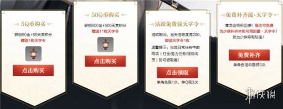 1.在页面购买相应数额的碎银礼包,可获赠相应数量的“天字令”。其中,购买5Q币碎银礼包可获赠一个天字令(单角色限800次),购买50Q币可获赠11个天字令(单角色限80次)。