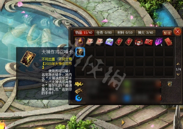 大神炸鸡抽奖箱:【2020年大神炸鸡节】打开后,可获得1份随机奖励,如:70级原初之火、30星神XO礼包、4级兽灵圣水、31.5星XO礼包、珍兽灵药、开天之曜神火匣、绯梦姬红莲礼包、紫幻姬罗兰礼包等好礼。