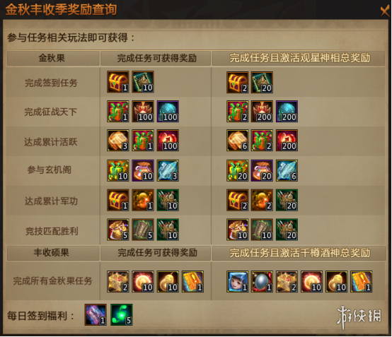 完成所有金秋果任务可获得以下奖励,激活【诸葛亮*观星神相】后可获得的奖励翻倍。