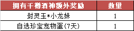 完成所有金秋果任务可获得以下奖励,激活【张飞*千樽酒神】后可额外获得:辛宪英新换装——【封灵玉*小龙妹】和1个自选珍宝宠物蛋(7天)。