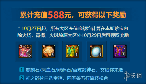 不过除了火烧连营,青梅煮酒,火凤燎原外,其他大区只能在10月29日后领取(充值的金额算在内,领取只能在更新后才可以)。