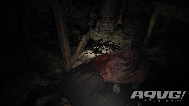 调查一个被铁链锁住的房间,可以在装满血水的盆子里找到一把开锁工具。另一个被铁链锁住的房间里似乎什么都没有,只有一具吊起来掏空了内脏的尸体。
