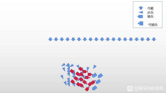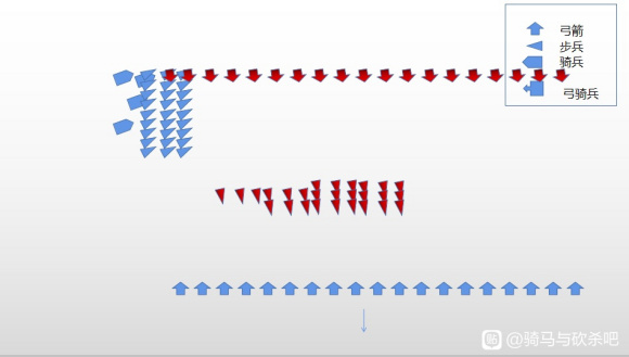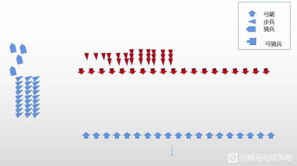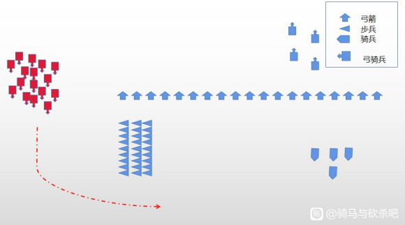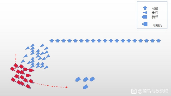 将弓骑兵派出拖延对方大部队前进的速度,在库跑跑弓骑兵进入队列的后方后,步兵开散阵一拥而上,骑兵也开f3前往拦截,由于我方队列非常之宽,而库跑跑的弓骑兵退路被步兵切断又不会选择强冲队列很快就会停下或者乱走从而被步兵追上。