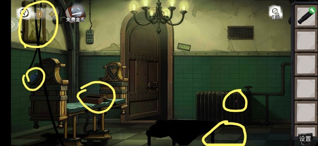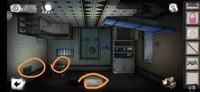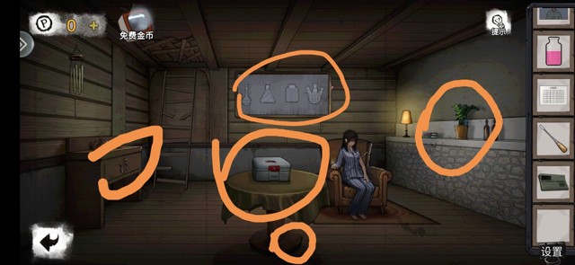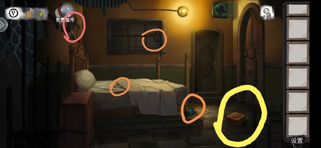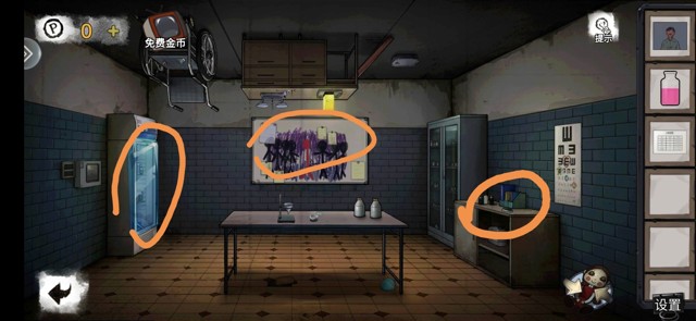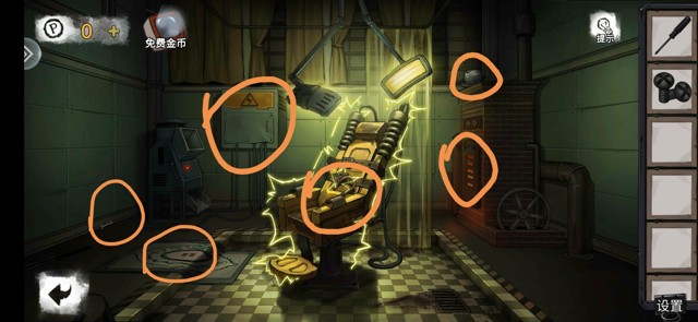 调查黄色处,分别是画,医用口罩,松动的地砖,得到按钮。床上有第一个小游戏打开得到螺丝刀柄。(此时小游戏的难度十分睿智让我感觉自己聪明极了,涉世未深的我尚未明白人世险恶)