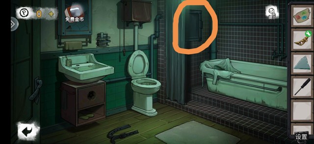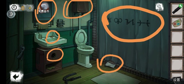 调查分别得到医用口罩,凹槽,缺少按钮和指针的表,按钮直接摁上免得忘了。翻翻垃圾桶找到木板和纸片,用木板把吊灯上的钥匙打下来,拾取后回到卧室打开浴室门