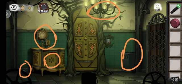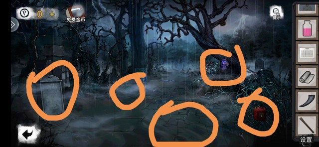 在愉快的游戏之后我都忘了自己是在写攻略了,你们就假装我画圈的地方有东西吧!墓碑上有面具,医用口罩,医用口罩后面的指示牌上有石块。木棒,用木棒拨开荆棘,汽油木棒纱布组合在一起,一会儿再回来收拾树上的马蜂。回房间2房顶,用漏电的灯点燃火把。房间1房顶使用面具得石块,回去烧马蜂,打开笔盒拿钢笔。把三个石块放进墓碑,打开棺材是一个很简单的小游戏,得到螺丝刀后先回房间2打开通风口,拿指北针,再回房间1书桌上用钢笔吸墨水,房间3房顶的罐头用螺丝刀打开拿到钥匙,房顶的画,用钢笔涂抹,得到指北针指针,组合回到迷失森林跟着红针一路向北走。