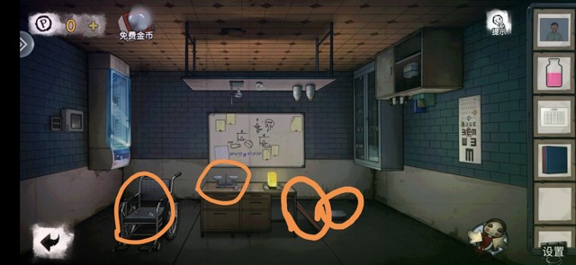 医用口罩,鬼脸,铁棍,用铁棍撬开病床得到鬼脸。柜子里有线索入院名单,广口瓶和书柜二层的提示。房间1解锁桌子上的鬼脸得到圆块,解锁房间2下层柜子的机关,得到金属块,拾取布偶后回到房间1,取出布偶拽舌头