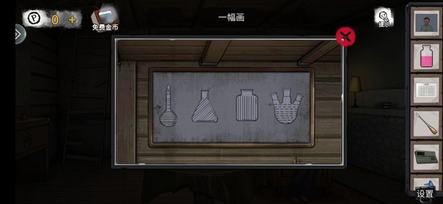 椅子上有纱布和火柴,桌子上是万恶的小游戏,完成后得到石块(此时小游戏逐渐开始吃力,靠运气随便点了几下过去了)还有根镁条。右边板子上是需要笔的画,一只拉环坏掉的罐头。